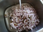 Als ich die Kirschblüten trocken „geschleudert“ hatte, gab ich sie in einen Gefrierbeutel (ein Zipper-Beutel wäre besser, hatte aber leider keinen). Über die Blüten das Salz streuen und die Salzlake langsam dazugießen. Dann den Beutel verschließen und alles vorsichtig vermengen und die Luft rausdrücken. Durch das Kneten fallen die Blüten zusammen und die Flüssigkeit sollte sich leicht rosa färben.