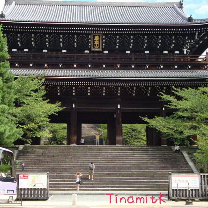 Also machten wir uns auf zum Nanzen-ji  (jap. 南禅寺) . Der Hase lief sofort die Treppe zum riesigen Eingangstor hinauf und rief mir nebenbei noch zu: „ Mach mal ein Foto!!“. Doch dazu kam ich erstmal nicht. Kaum hatte er mich alleingelassen stürmten auf einmal ein paar japanische Schulmädchen auf mich zu. Erst verstand ich gar nicht was sie von mir wollten, bis mir klar wurde, dass sie es auf meine Euro’s abgesehen hatten. Ich fing also an in meinem Geldbeutel zu kramen, denn jede hielt mir mit strahlenden Augen ein 100 Yen Stück (ca. 1 EUR) hin. Nachdem ich die ersten Geldstücke „gewechselt“ hatte, trauten sich dann auch die Jungs der Gruppe an mich heran. Es dauerte eine ganze Weile, bis mir dann das Geld ausging. (^_^) Der Hase hatte zwischenzeitlich das Treiben um mich herum aus weiter Ferne beobachtet. Ich machte das ersehnte Foto und stieg ebenfalls die vielen Stufen zum Nanzen-ji hinauf. Als wir oben ankamen waren wir allerdings enttäuscht. Denn leider war der Tempel durch ein riesiges Gerüst (mehr eine Halle) umbaut, da dort Restaurierungsarbeiten stattfanden. Wir schossen noch ein paar Fotos. Anschließend machten wir uns auf den Rückweg.
