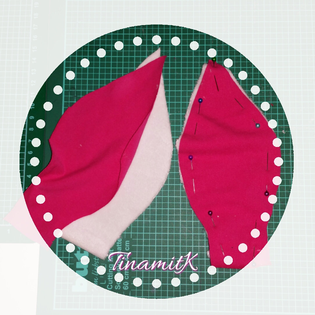 Die Ohrenteile werden zusammen genäht und dann auf rechts gewendet. Das Bauchfell wird auf das Kleidvorderteil appliziert.