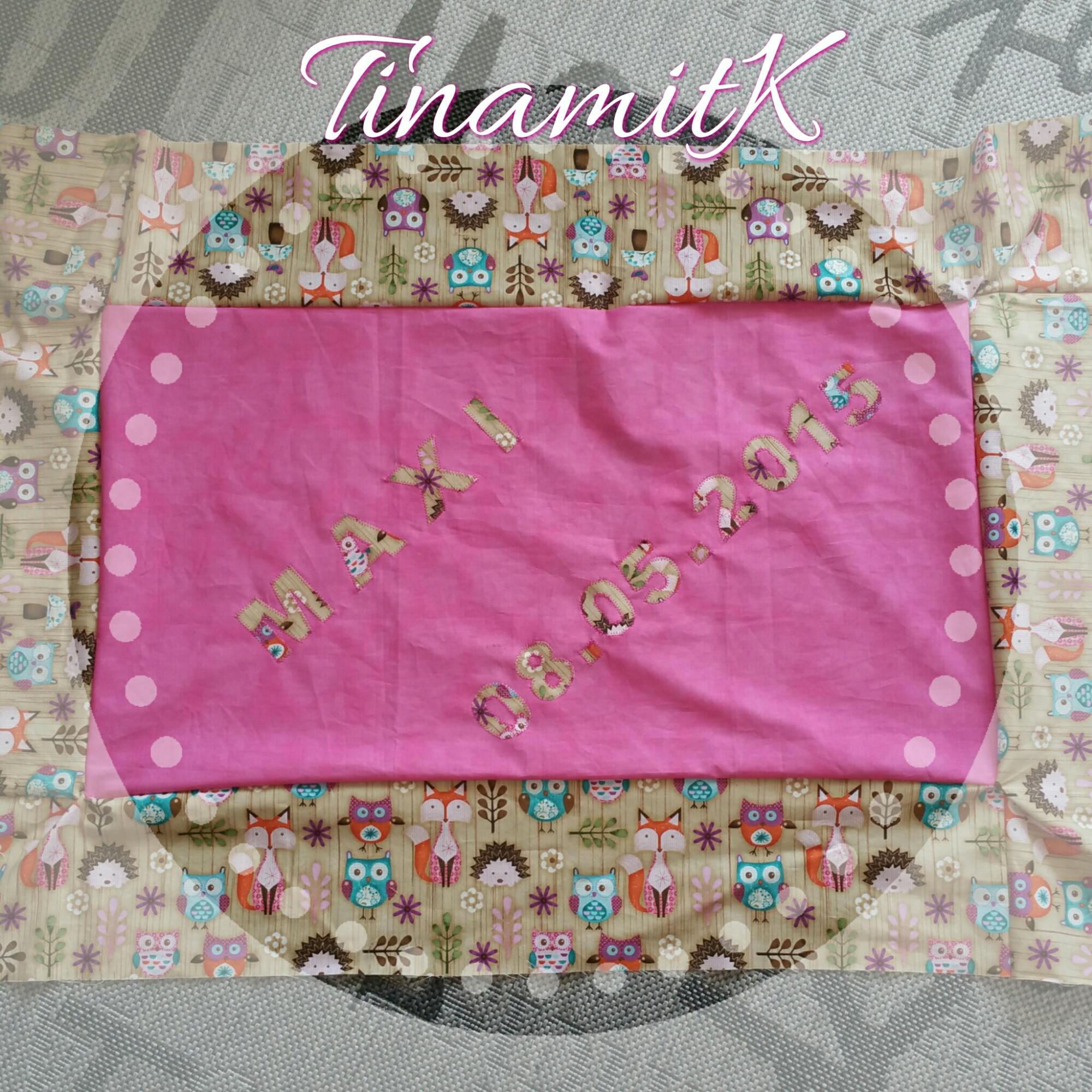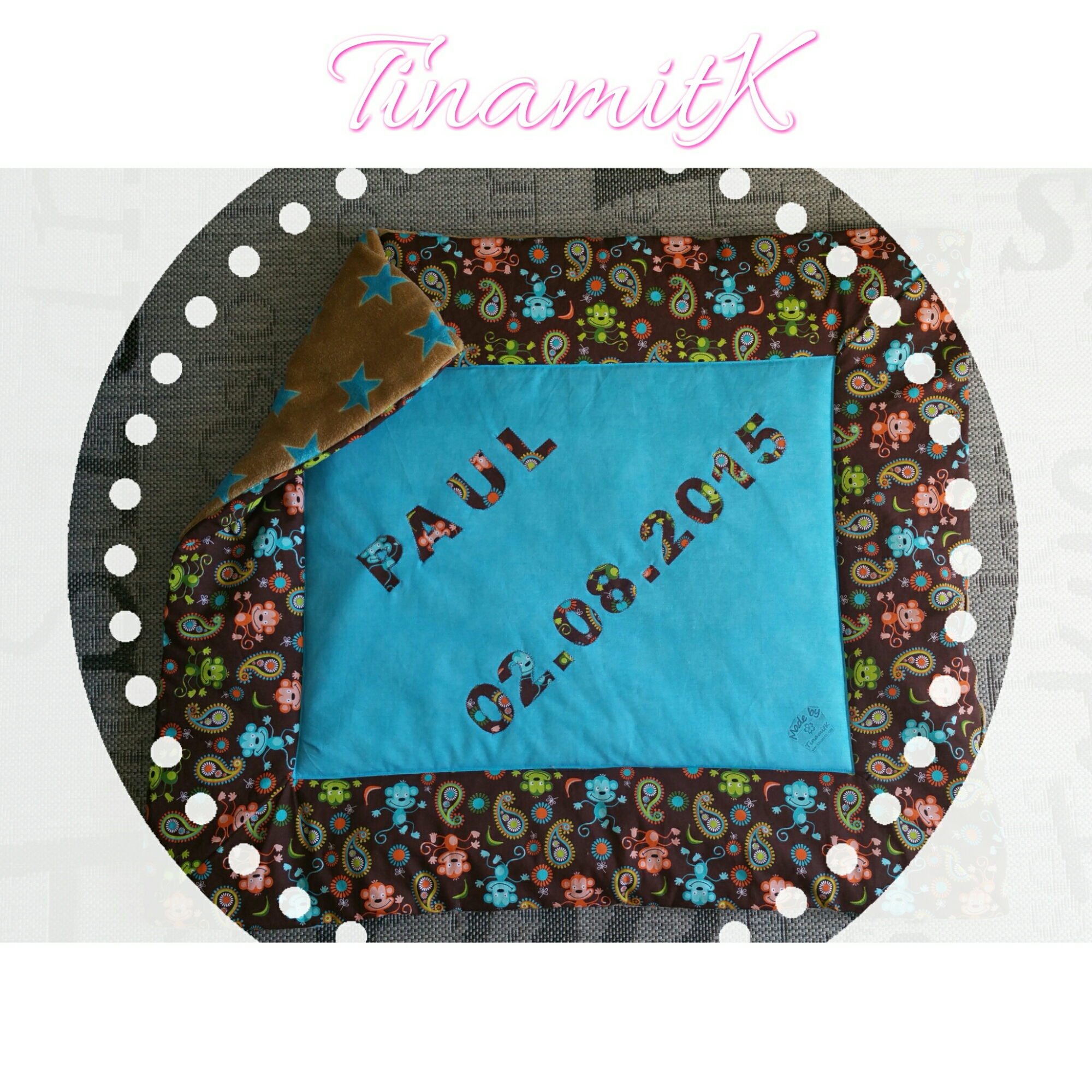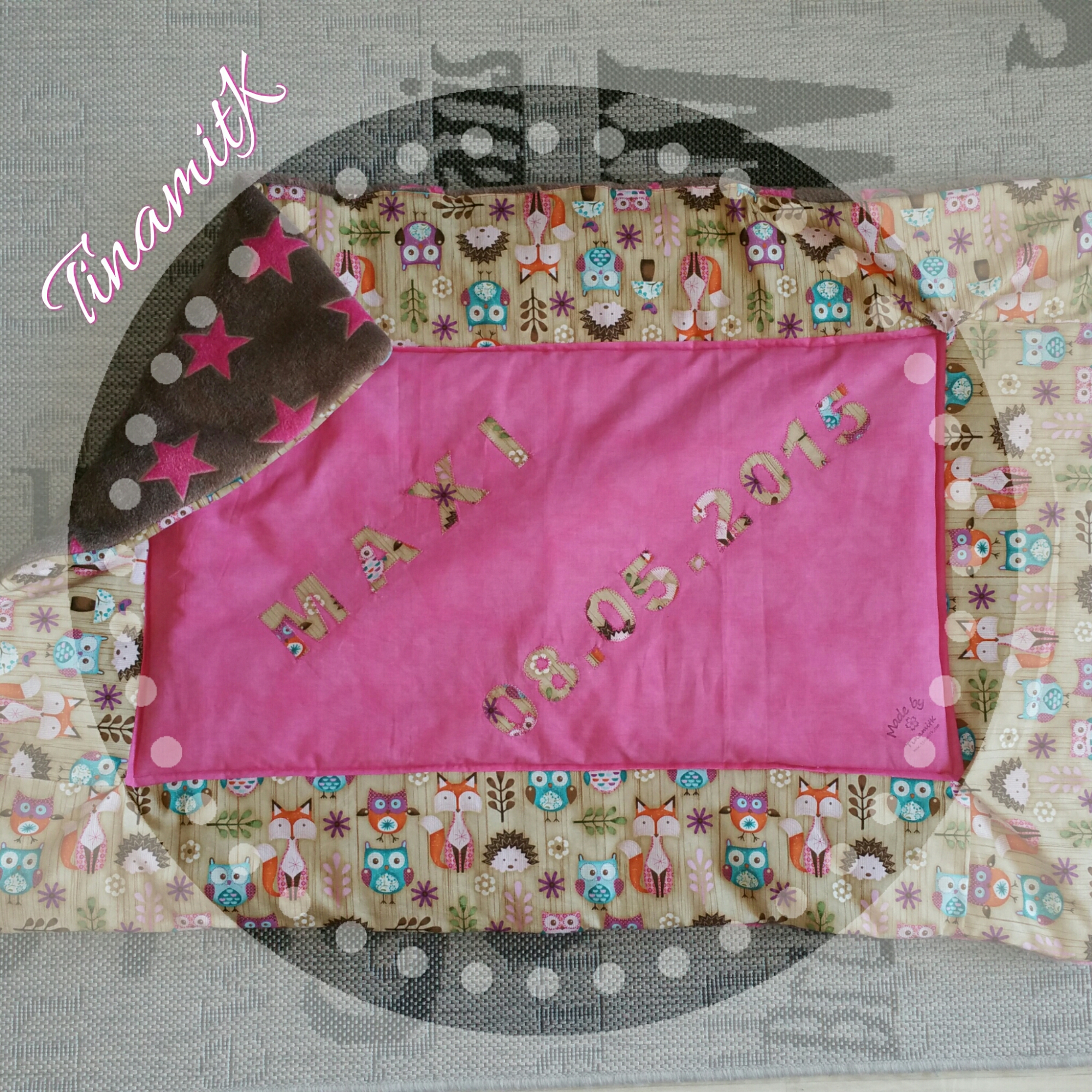 Als Unterseite wählte ich ein kuscheliges Wellnessfleece in braun mit pinken Sternen. Für die Oberseite eine unifarbene pinke Mitte und für die Umrandung sowie die Applikationen (Name u. Geburtsdatum) den tollen Stoff „Woodland Critters“ mit ganz niedlichen Waldtieren.