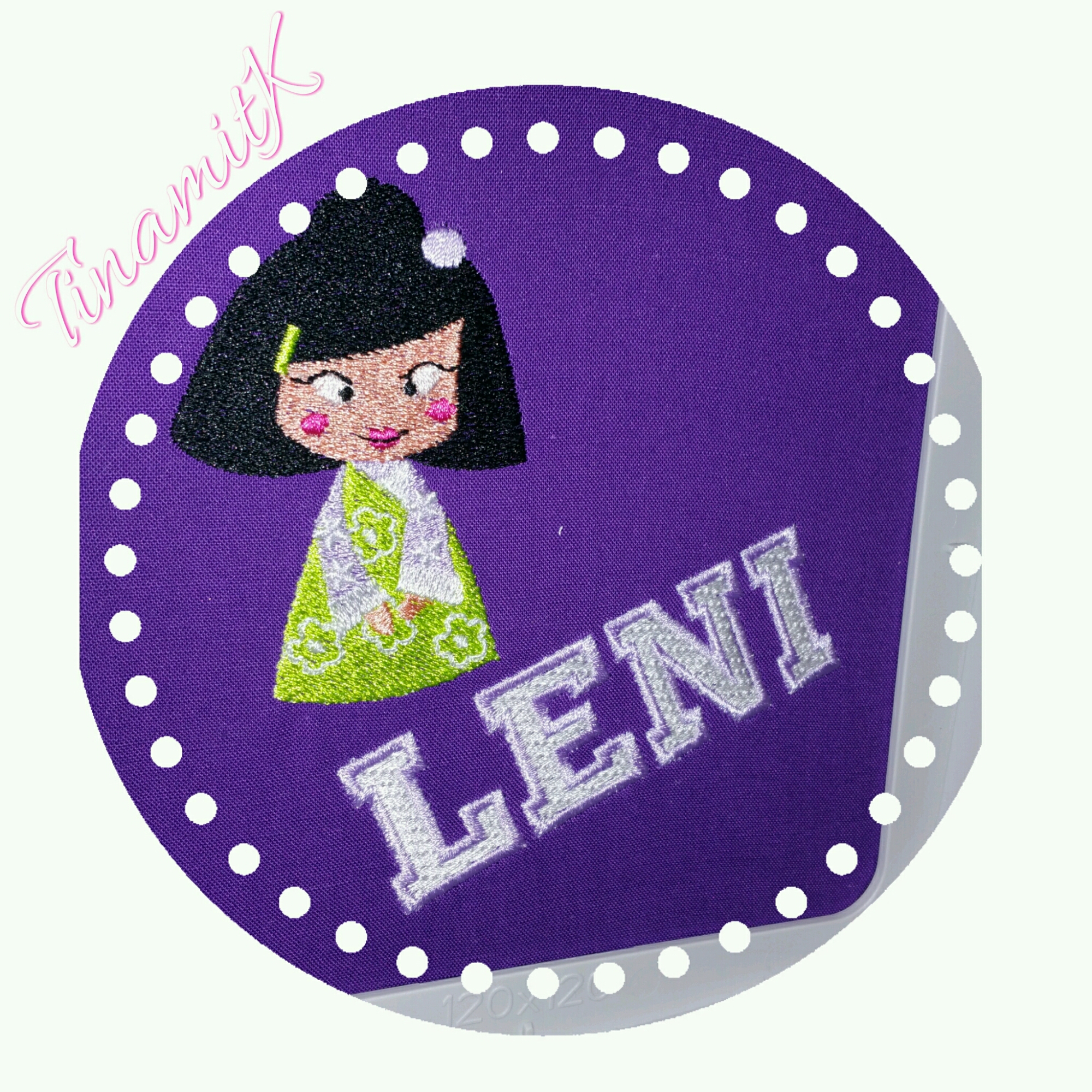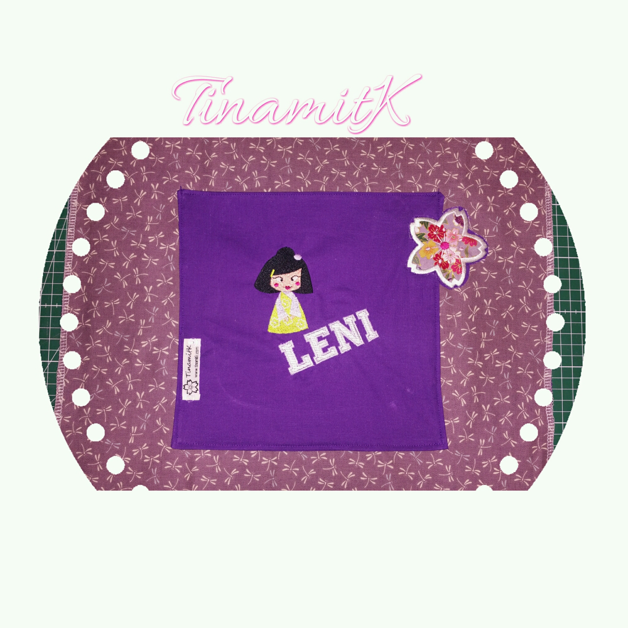 Um den Stoff für die aufgesetzte Tasche zu verzieren hatte ich mir aus den tollen Stickdateien von Kunterbuntdesign das Set Ling Ling ausgesucht. Eine Kirschblütenapplikation und Frl. Ling sollten es werden. Im Stickprogramm für meine Nähmaschine habe und dann noch einen Namen hinzugefügt.