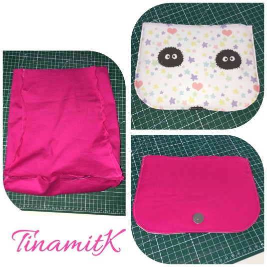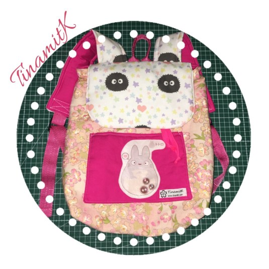 Als Highlights verwendete ich für die Träger und die Klappe einen Baumwollstoff mit den kleinen Staubgeistern aus dem Film となりのトトロ (Mein Nachbar Totoro), gekauft bei Spoonflower und auf die Außentasche setzte ich ein Bild von Totoro.