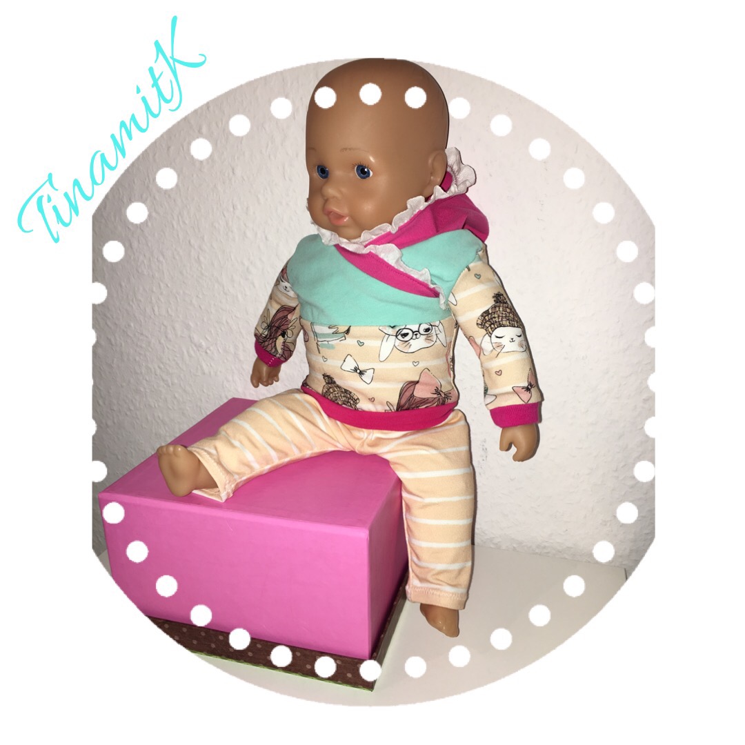 Nunja. Nun hat besagtes Schrankbett – wie der Name schon sagt – einen integrierten Schrank. Oben ist das Bett, unten eine Kleiderstange und zwei Schubladen. Für den Schrank bzw. die Kleiderstange fehlen in unserem Haushalt jedoch die Sachen. Bislang sind beide Puppen mit ihren mitgelieferten Kleidungsstücken vollkommen ausreichend eingekleidet gewesen. Jetzt ist das anders. Ich würde es ja nicht ertragen, wenn mein Kind keine Puppenkleidung hat, die es an die besagte Kleiderstange hängen kann. Also habe ich mir kurzerhand das Schnittmusterset „Puppenliebe“ von RosaRosa besorgt und angefangen Puppensachen zu nähen.