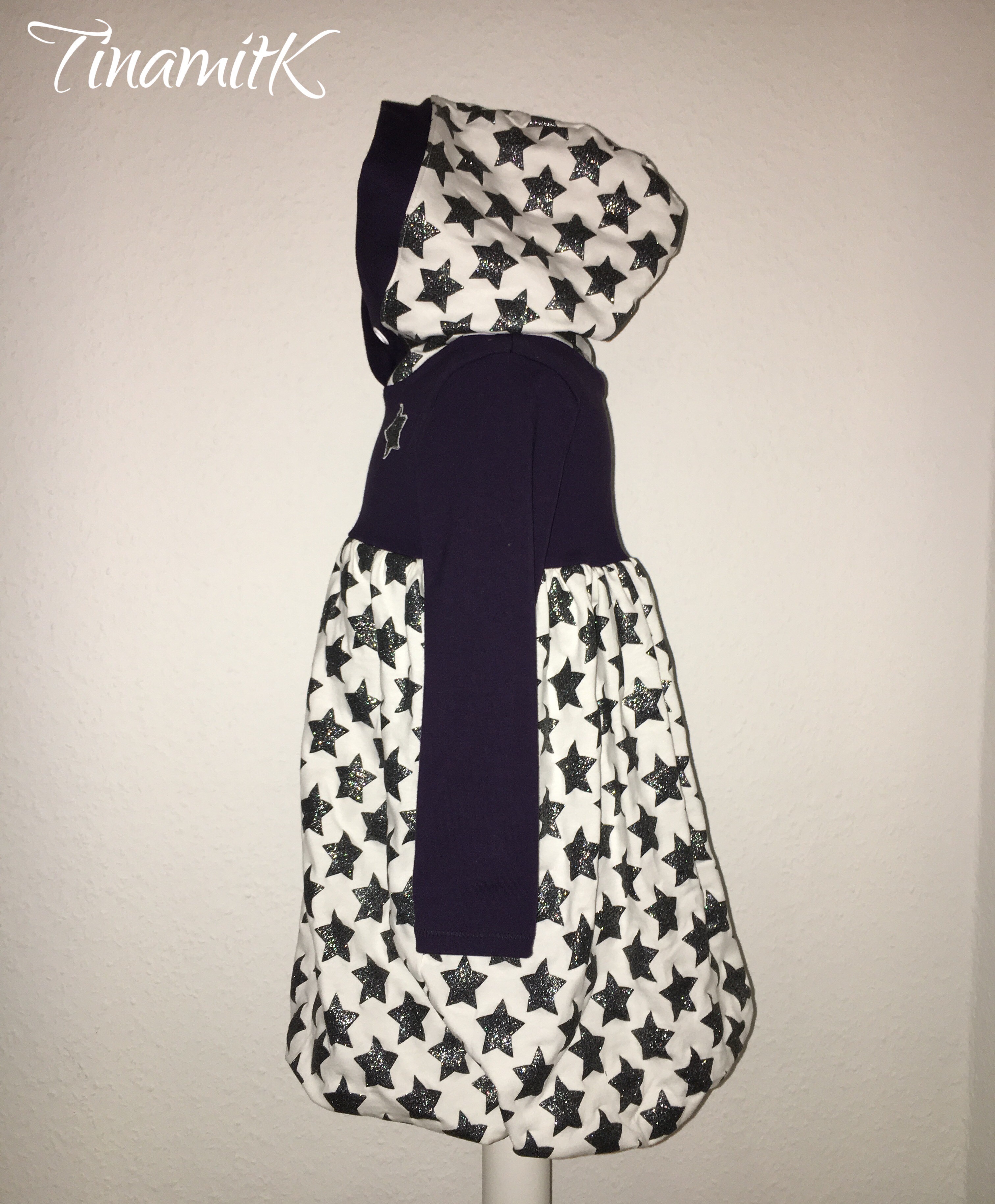 Ausgewählt habe ich hierfür einen dunkellilanen Uni-Jersey und einen mit Glitzer-Popitzer-Sternen. Nachdem ich bereits die Teile für das Oberteil und die Ärmel zugeschnitten hatte, durfte ich feststellen, dass der dunkellilane Stoff nicht ausreichte. 🤦🏼♀️ Zum Glück fand ich in meiner Restebox noch ein Stück lilanen Viskose-Jersey. Eigentlich bin ich nicht der Fan von Viskose für Kinderkleidung. Da dieser jedoch nur für den innerliegenden Rockteil war, habe ich mal beide Augen zugedrückt.