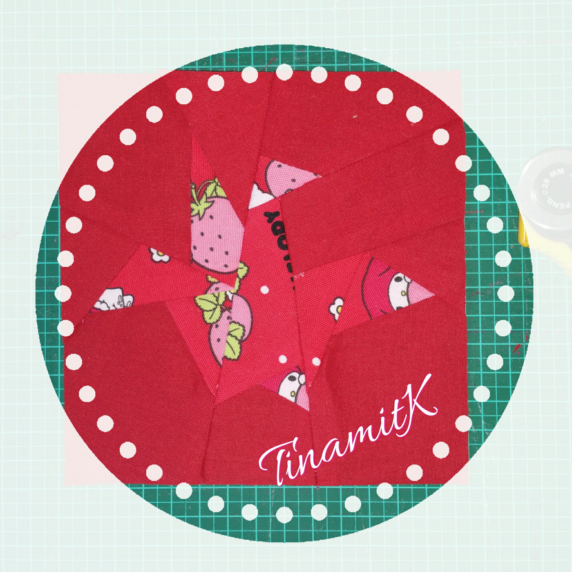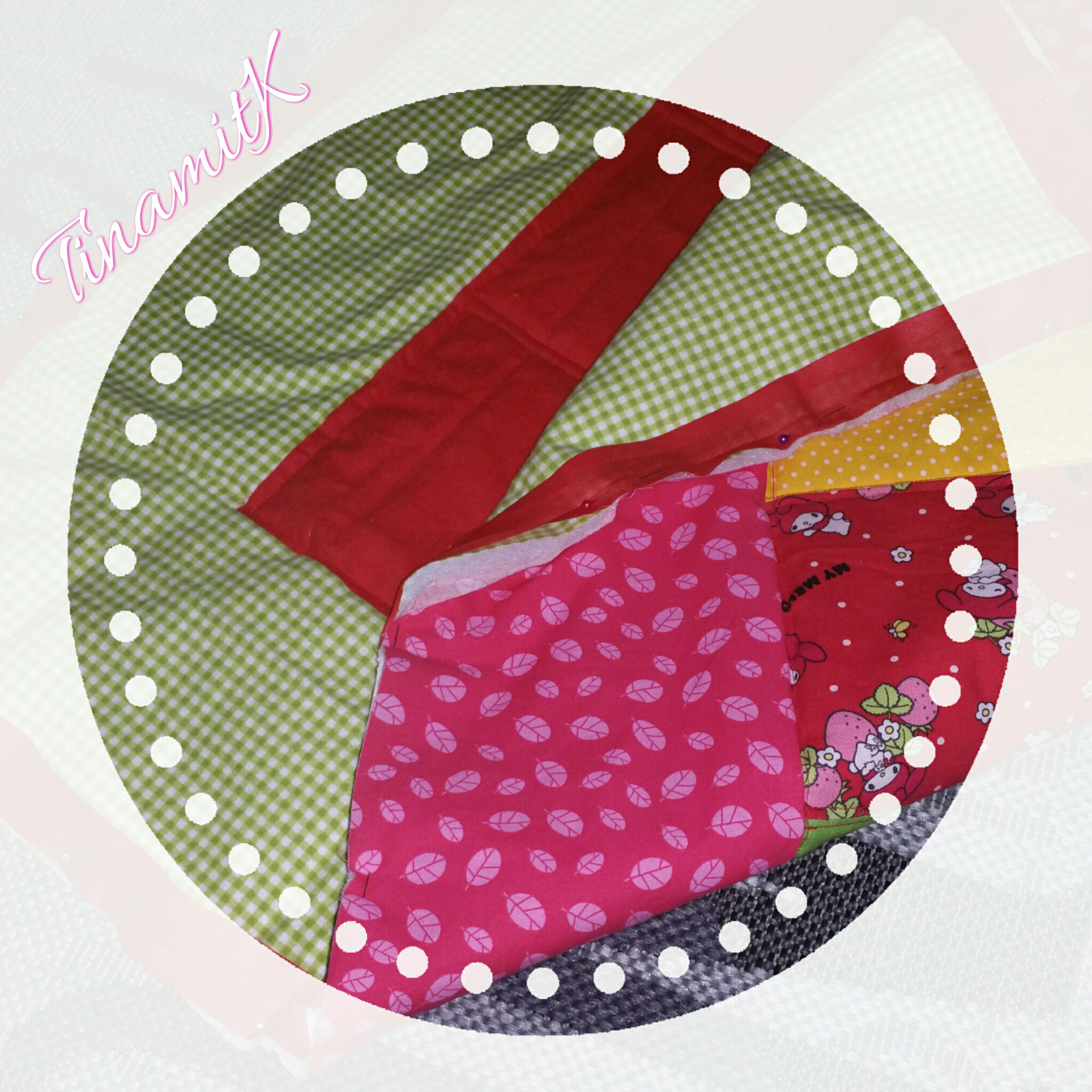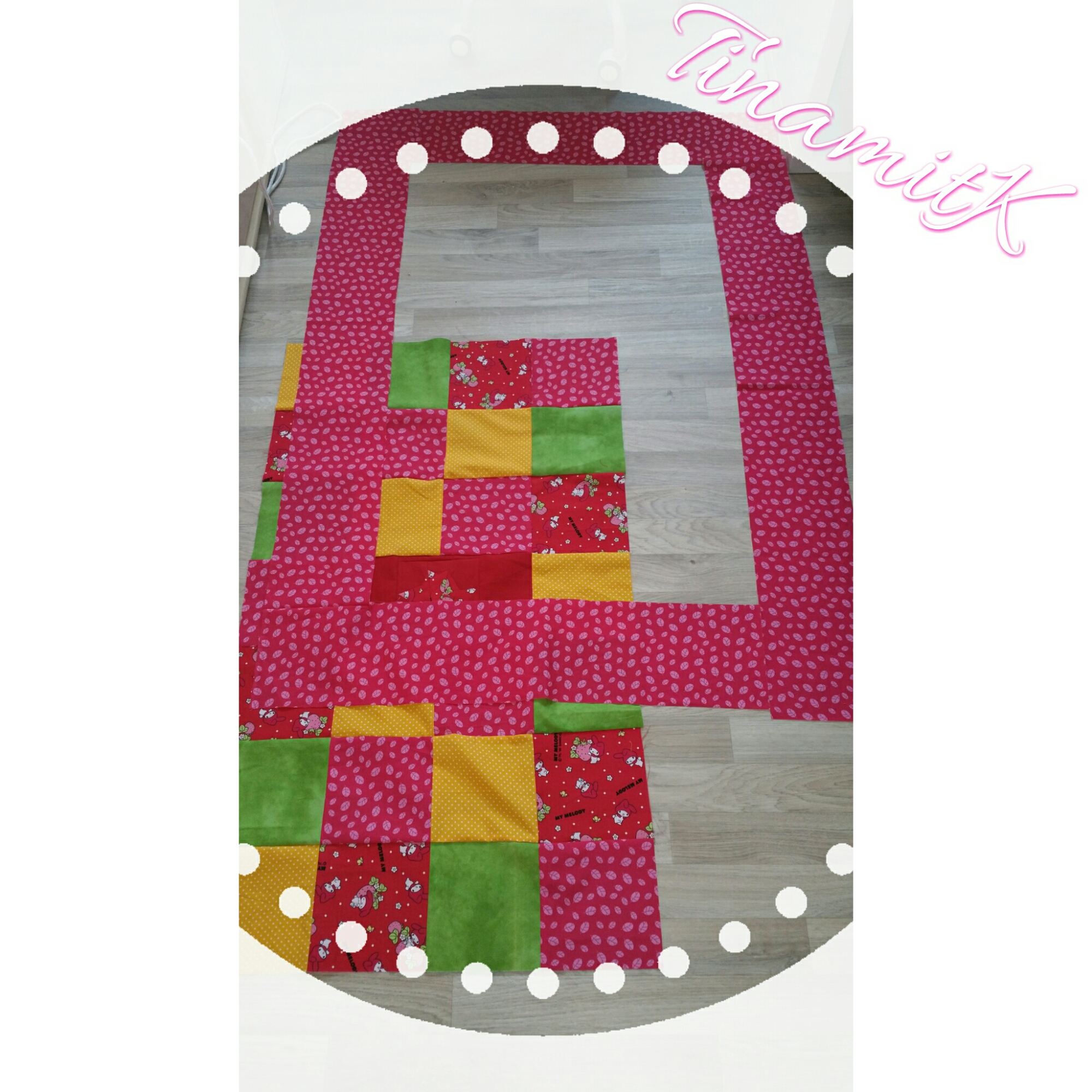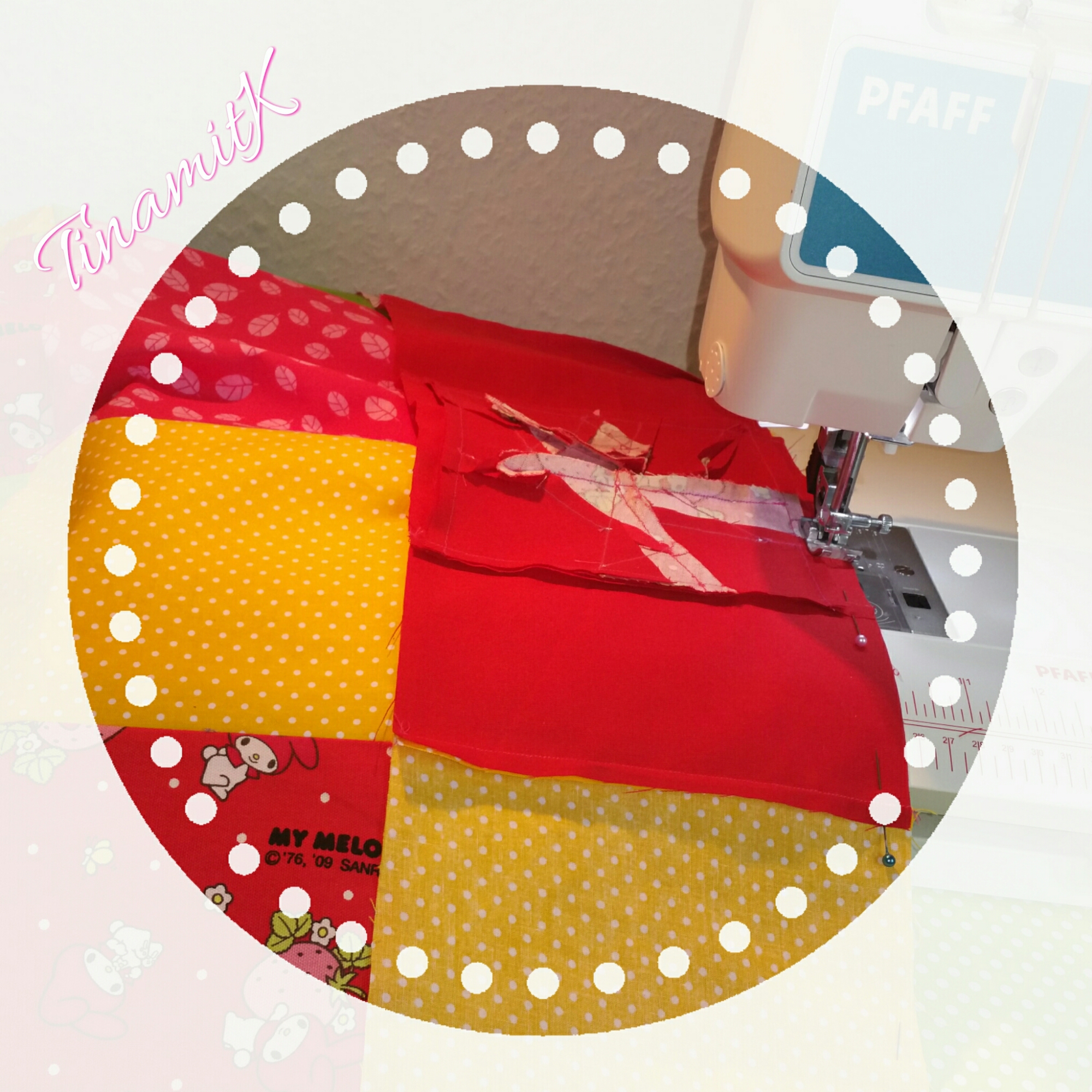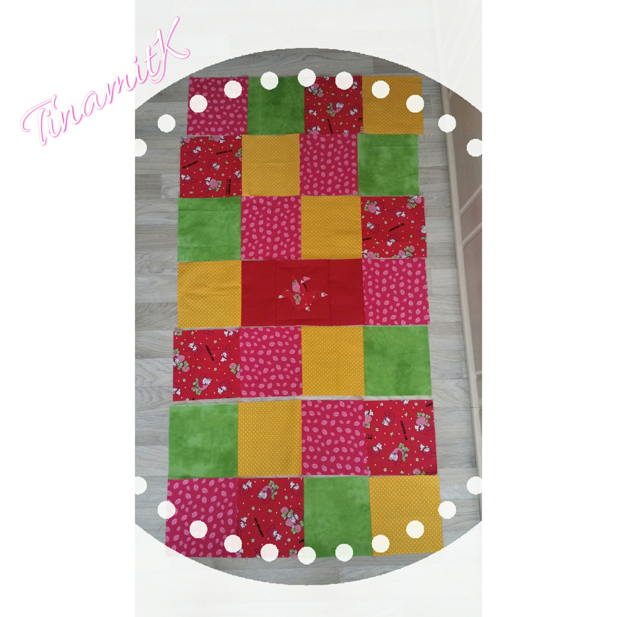 Bei meinem Muster fällt sofort die Mitte ins Auge, denn sie ist leer. Leider stellte ich erst nach dem Zuschneiden der Quadrate fest, dass ich von meinem My Melody Stoff nicht genug hatte. Ich musste mir also etwas für die Lücke einfallen lassen.