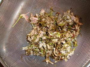 Die Masse sah echt schrecklich aus. Lediglich die 3-4 Blüten meines Kanzan-Baumes sahen im Ansatz so aus, wie die aus meinem Rezept. Zwar roch das Ganze wirklich herrlich nach Kirschen, aber eine Weiterverarbeitung wäre in Anbetracht der fast grauen und matschigen Masse sinnlos gewesen.